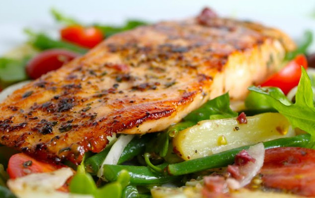 Σολομός ή και τόνος -δεν μας πειράζει, καθώς και τα δύο αυτά ψάρια είναι σούπερ υγιεινά και περιέχουν πρωτεΐνη και πολύτιμα λιπαρά ωμέγα-3. Συνδυάστε με φασόλια – ό,τι είδος προτιμάτε και λαχανικά της αρεσκείας σας. Τέλειες επιλογές τα ντοματίνια, λίγο αγγουράκι και καλαμπόκι.
