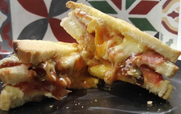 Υλικά: 6 φέτες ψωμί του τοστ, 3 κουταλιές της σούπας μαγιονέζα, 3 κουταλιές της σούπας τυρί κρέμα, 1 ώριμη, σφιχτή ντομάτα κομμένη σε κάθετες στρογγυλές φέτες, 2 τηγανιτά αυγά, 4 φέτες ζαμπόν, 4 φέτες μπέικον, 4 φέτες τυρί του τοστ ή τυρί τσένταρ