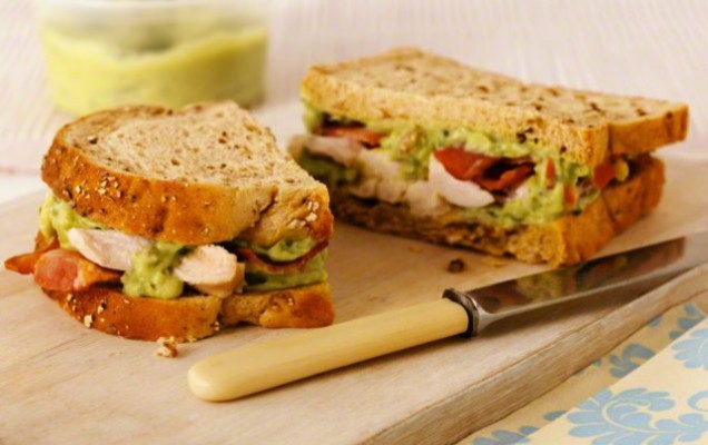Υλικά: κομμάτια στήθος κοτόπουλου κομμένα σε μπουκιέ, 8 φέτες ψωμί της αρεσκείας σας (χωριάτικο, ολικής), 8 φέτες ντομάτας, 4 φέτες μπέικον ή καπνιστή γαλόπουλα (σοταρισμένες ελαφρά στο τηγάνι), 1 κουταλιά της σούπας μαϊντανός ψιλοκομμένος, 1 κουταλάκι του γλυκού βασιλικός ψιλοκομμένος, ¾ του φλιτζανιού του τσαγιού μαγιονέζα, 3 κουταλιές της σούπας γιαούρτι, 1 κουταλιά της σούπας μουστάρδα, λίγο άσπρο πιπέρι, λίγο βούτυρο