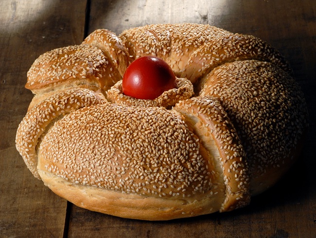 Υλικά: 1 κιλό αλεύρι για όλες τις χρήσεις, 20 γρ. αλάτι, 50 γρ. ζάχαρη, 600 γρ. νερό, 60 γρ. βούτυρο, 30 γρ. γλυκάνισο, 25 γρ. ξηρή μαγιά, σουσάμι για το πασπάλισμα, 1 βρασμένο κόκκινο αυγό για τη διακόσμηση