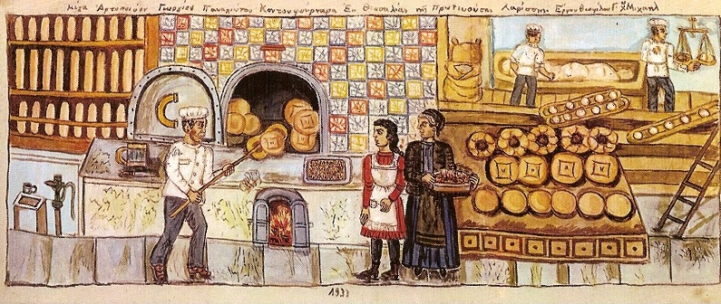 Από τον Καραγκιόζη στο Θεόφιλο. Το ψωμί πέρα από τη διατροφή μας έχει σημαδέψει τη γλώσσα μας, τις κοινωνικές μας αξίες και τη λαϊκή μας τέχνη. Φράσεις όπως «τίμα το ψωμί σου», «βγάλε το ψωμί σου», «μα το ψωμί που τρώω», «μαζί φάγαμε ψωμί κι αλάτι» συνδέουν το «ύψιστο διατροφικό αγαθό» με άλλες «ύψιστες» έννοιες, όπως της αξιοπρέπειας και του φιλότιμου, της εργασίας και της επιβίωσης, της εμπιστοσύνης, της φιλίας. Το θέατρο σκιών, μια από τις λαϊκές παραδοσιακές τέχνες, που άνθησε στο πρώτο μισό του 20ού, έκανε πολλές γενιές πιτσιρικάδων να ξεκαρδίζονται στα γέλια στις πλατείες των χωριών με τα παθήματα του Καραγκιόζη. Από τις πλέον κλασικές και αγαπημένες η ιστορία του φούρνου του γέρο-Σαμπαναγά, που είναι δίπλα στο σαράι και ο καπνός του ενοχλεί τον Πασά. Έτσι δίνει εντολή να κλείσει. Ο Σαμπαναγάς επινοικιάζει το φούρνο στον Χατζηαβάτη μήπως εκείνος καταφέρει να τον λειτουργήσει. Ο Χατζηαβάτης αναζητώντας ένα καλό ψήστη, πέφτει πάνω στον Καραγκιόζη, που με τη γνωστή κατεργαριά τον πείθει ότι είναι ο πλέον κατάλληλος για τη δουλειά και σίγουρα ο ιδανικός πρωταγωνιστής της παράστασης «Ο Καραγκιόζης φούρναρης» [PΗΟΤΟ: Ζωγραφική ρεκλάμας “Ο Καραγκιόζης φούρναρης”]. Από τον Καραγκιόζη στο Θεόφιλο ο συνειρμός μπορεί να μην είναι δεδομένος, η σχέση με το ψωμί πάντως είναι. Ο μεγάλος λαϊκός ζωγράφος δε θα μπορούσε να αφήσει τη μαγεία του φούρνου έξω από το πεδίο του. Το 1933 ζωγραφίζει το «Μέγα Αρτοποιείον Γεωργίου Παναγιώτου Κοντουφούρναρη Εκ Θεσσαλίας της Πρωτευούσης Λαρίσσης», ένας πίνακας που σήμερα βρίσκεται στο χαμένο μες τα λιόδεντρα μουσείο του στη Μυτιλήνη. Με τη σχεδόν παιδική ματιά του Θεόφιλου βλέπουμε τη ζωή στο εσωτερικό ενός φούρνου: ο φούρναρη μπροστά στον παλιό φούρνο ξεφουρνίζει τα φρεσκοψημένα καρβέλια, δύο γυναίκες περιμένουν δίπλα στα έτοιμα για πούλημα ψωμιά, στο βάθος εργάτες ζυμώνουν το νέο ψωμί…Το «σουρεαλιστικό» με την εικόνα έγκειται πως όλα τα ψωμιά είναι κάθετα –όρθια για την ακρίβεια χωρίς να σέβονται τις τρεις διαστάσεις του χώρου ή το νόμο της βαρύτητας. Είτε πρόκειται γι’ αυτά που ξεφουρνίζονται είτε πρόκειται για τα έτοιμα παραδίπλα, τα αρτοσκευάσματα του ζωγράφου δημιουργούν την απορία στο θεατή πώς δεν κατρακυλάνε. Όταν κάποτε τον ρώτησαν γιατί τα ζωγράφισε έτσι αφού δίνουν την αίσθηση σε εκείνον που τα κοιτάει ότι μπορεί να πέσουν ανά πάσα στιγμή, ο Θεόφιλος έδωσε τη δική του μνημειώδη απάντηση: «Μόνο τα πραγματικά ψωμιά πέφτουν»!
