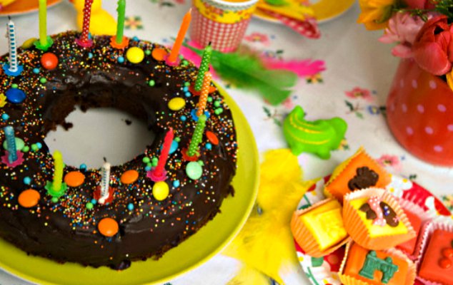 Το κέικ ντύθηκε για πάρτι. Η σοκολάτα ξετρελαίνει τα παιδιά και η γεύση του κέικ είναι αγαπητή σε όλα τους. Φτιάξτε ένα απλό κέικ με κακάο ή κουβερτούρα, ντύστε το με πλούσιο γλάσο σοκολάτας και δώστε την πολυχρωμία που λατρεύουν τα παιδιά, διακοσμώντας το με χρωματιστά σοκολατάκια τύπου σμάρτις, χρωματιστή τρούφα και φαντεζί κεράκια. Ανάλογα με τους καλεσμένους διπλασιάστε την ποσότητα της ζύμης αν χρειάζεται –κανείς δε σας υποχρεώνει να βάλετε το κέικ σε στρογγυλή φόρμα με τρύπα. Μπορείτε να χρησιμοποιήσετε παραλληλόγραμμο σκεύος και αν θέλετε να κόψετε το κέικ στη μέση κατά μήκος και να το γεμίσετε με επιπλέον σοκολάτα.