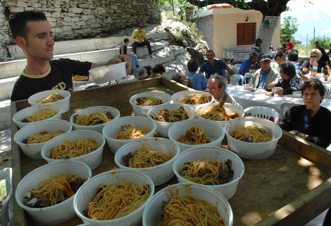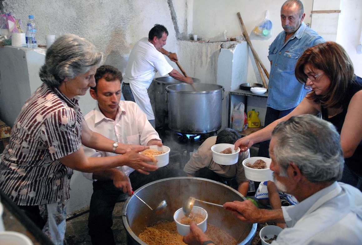 Τα μακαρόνια με κατσίκι από την περιοχή του Ταϋγέτου. Φαγητό-προσφορά στους επισκέπτες του παραδοσιακού πανηγυριού, στα Ριζανά περιοχή του Ταϋγέτου, στη γιορτή του Αγίου Παντελεήμονος στο Μεσσηνιακό. ΦΩΤΟ Αρχείου ΑΠΕ: Νικήτας Κώτσιαρης, Ιούλιος 2006.