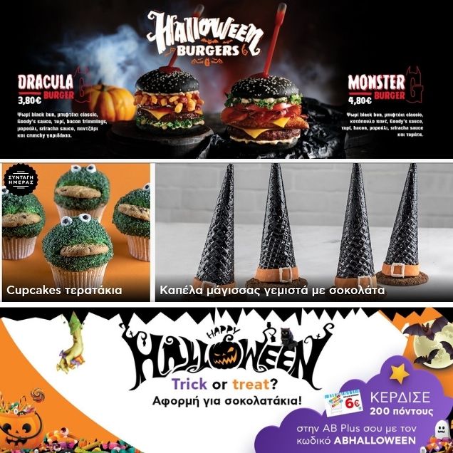 Τα σούπερ μάρκετ ΑΒ Βασιλόπουλος με σλόγκαν «Happy Halloween – Trick or Treat? – Αφορμή για σοκολατάκια» διαφήμιζαν σχετική προσφορά για τα e-shops τους προσφορά που ίσχυε μέχρι τις 28.10.20.
