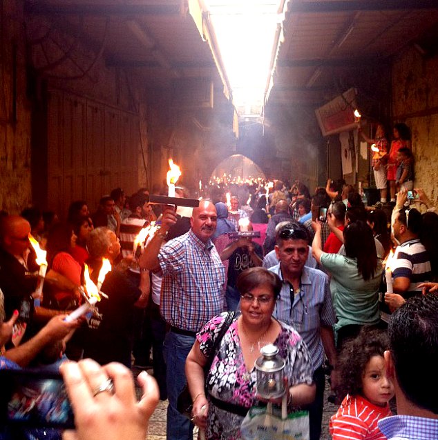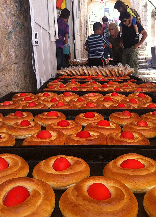 Στο διπλανό στενό, τα τσουρέκια με τα κόκκινα αυγά. Αφράτα, μαστιχωτά, μυρωδάτα τσουρέκια μόλις έχουν βγει ζεστά ζεστά στο λιθόστρωτο σοκάκι κοντά στον Πανάγιο Τάφο. Σε λίγα λεπτά που θα τελειώσουν οι πανηγυρικές παρελάσεις για την άφιξη της Φλόγας και τα πλήθη των χριστιανών, μεταξύ των οποίων πολλοί Έλληνες, ξεχυθούν στα παράπλευρα δρομάκια, τα τσουρεκάκια αυτά θα γίνουν ανάρπαστα.