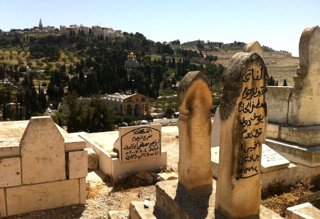 Στο βάθος, ο Ναός της Αγωνίας. Μουσουλμανικοί ταφοί στην Παλιά Πόλη. Στο βάθος το Όρος των Ελαιών και ο Ναός της Αγωνίας (σημερινή Εκκλησία των Εθνών), ιερό που αναφέρεται στις σπαρακτικές ώρες του Ιησού στον Κήπο της Γεσθημανής.