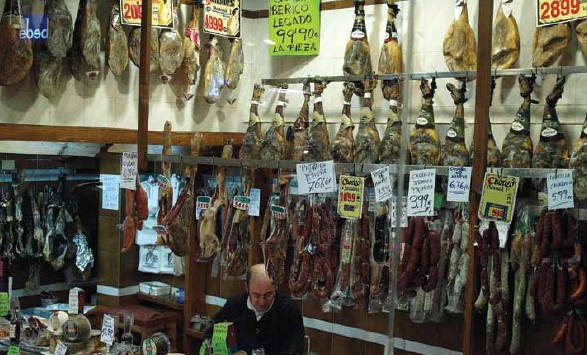 Οι δύο αυτές διατροφικές παραδόσεις της επεξεργασίας του κρέατος απέκτησαν οριστική μορφή στην Ισπανία του 19ου αιώνα, αρχικά στο πλαίσιο της οικιακής οικονομίας και από τα μέσα του αιώνα σε μορφή μικρών τοπικών βιοτεχνιών. Προκειμένου να καταδυθούμε στη γαστρονομική ιστορία της χώρας, επισκεφτήκαμε την Hoja de Carrasco, μια μικρή οικογενειακή βιοτεχνία στο Gijuelo (Γκιχουέλο), 50 χιλιόμετρα έξω από η Σαλαμάνκα. Ιδρυμένη στα τέλη του 19ου αιώνα, έχει περάσει στην τέταρτη γενιά της οικογένειας και διατηρεί πολλά παραδοσιακά στοιχεία, περιορίζοντας την εισαγωγή της σύγχρονης τεχνολογίας στα απολύτως απαραίτητα. Το Gijuelo αποτελεί ένα από τα πιο φημισμένα μέρη παρασκευής embutidos, καθώς το οροπέδιο σε υψόμετρο σχεδόν 1.000 μέτρων και το ψυχρό και ξηρό κλίμα συνθέτουν τις ιδανικές συνθήκες για τη διαδικασία ωρίμανσης των προϊόντων. Εκεί μεταφέρονται τα ήδη διαλεγμένα χοιρινά και σφαγιάζονται επιτόπου. Το χειμώνα, εποχή ακμής της παρασκευής, ο αριθμός μπορεί να ξεπεράσει τα 10.000 ζώα ημερησίως. Στη συνέχεια τεμαχίζονται και αφαιρείται το δέρμα, με εξαίρεση τα πόδια του ζώου που παραδίδονται ολόκληρα και με το δέρμα, προκειμένου να παρασκευαστεί jamon και paleta (παλέτα), δηλαδή jamon από τα μικρότερα μπροστινά πόδια.
