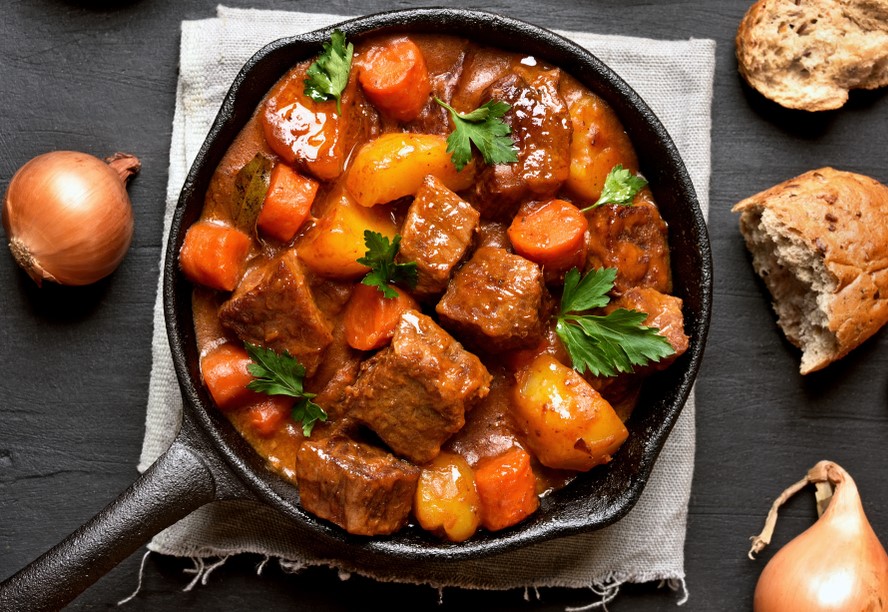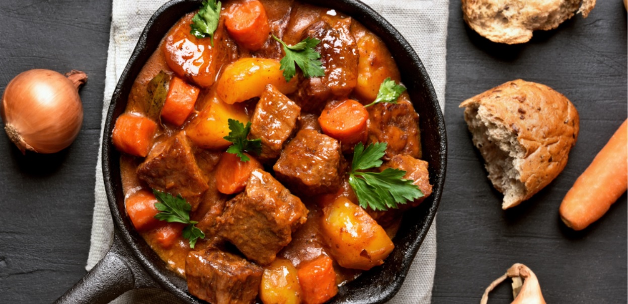 Η ουγγαρέζικη εκδοχή του κοκκινιστού, ενισχυμένη εδώ με άφθονα λαχανικά που το γλυκαίνουν, είναι ένα έξοχο, χειμωνιάτικο φαγάκι με γεμάτη και πλούσια γεύση. Αναζητήστε ένα αντίστοιχο κρασί: βουτυράτο, σοβαρό κι απολαυστικό, όπως τα κρασιά της ποικιλίας Merlot.