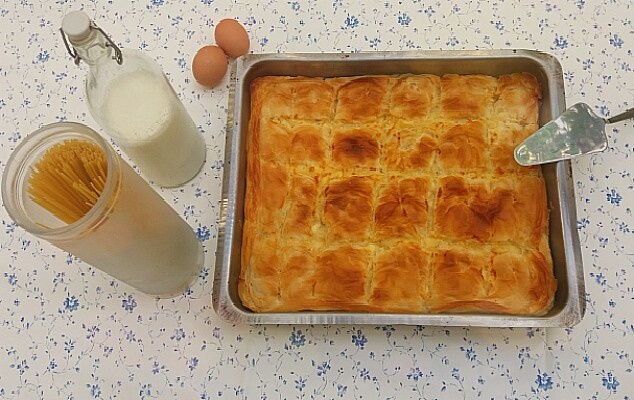 Υλικά: 10 φύλλα χωριάτικα (ή φύλλα κρούστας, αν προτιμάτε), 500 γρ. μακαρόνια Νο3, 300 γρ. φέτα, 400 γρ. κασέρι, 1 λίτρο φρέσκο γάλα, 5 αυγά, 5 κουταλιές της σούπας αλεύρι, 200 γρ. βούτυρο, 2 κρεμμύδι ψιλοκομμένα, αλάτι, πιπέρι