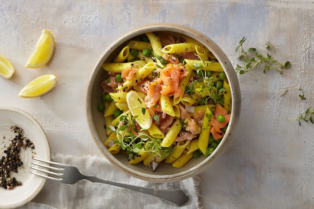 Συνταγή για πένες με αρακά και καπνιστό σολομό