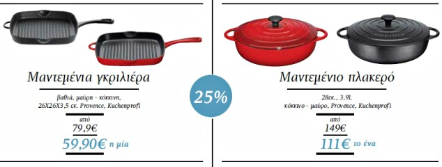 Tip1 Καλά μαντεμένια σκεύη. Ναι, υπάρχει κάτι που κάνει τα κυριακάτικα φαγητά «λουκούμι», το σπιτικό ψωμί νόστιμο σαν της γιαγιάς, τα όσπρια τέλεια χυλωμένα και μπορεί να απογειώσει γευστικά ακόμη και μια τηγανιά πατάτες: το μαντέμι! Καθώς η επεξεργασία και το καλούπωμα του χυτοσίδηρου, για να γίνει σωστά, είναι μια πολύ σύνθετη και κοστοβόρα διαδικασία που αυξάνει αισθητά την τελική τιμή του προϊόντος, οι Εκπτώσεις είναι μάλλον ιδανική περίοδος για να προμηθευτεί κανείς ένα καλό μαντεμένιο σκεύος σε πιο φιλική τιμή. Όπως η κόκκινη μαντεμένια χύτρα, διαμέτρου 26cm και χωριτικότητας 5,3l, της σειράς Provence της Kuchenprofi, που αυτές τις μέρες έχει έκπτωση -25%. Περισσότερα εδώ.