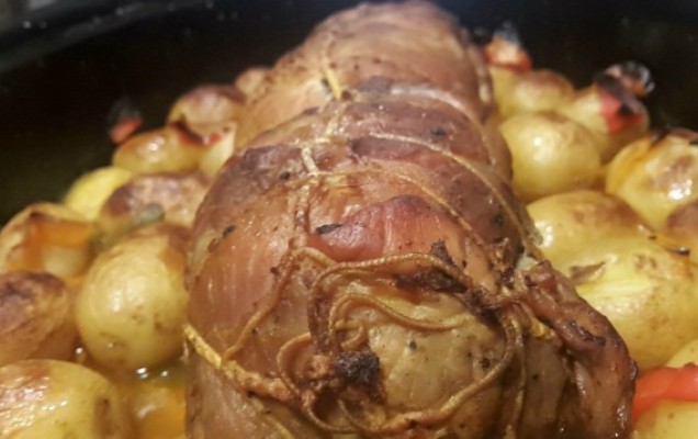 Εκτέλεση Αλατοπιπερώνετε καλά το κρέας και πασπαλίζετε με την πάπρικα. Το αφήνετε έτσι για 12 ώρες. Απλώνετε στη συνέχεια πάνω στο κρέας το τυρί, το τυλίγετε σε σφιχτό ρολό και το δένετε με σπάγγο. Τοποθετείτε το κρέας στη γάστρα, μοιράζοντας τις πατάτες γύρω του. Ρίχνετε το νερό, το κρασί και τις πιπεριές και το ψήνετε σε προθερμασμένο φούρνο στους 200° C για 2 1/2 ώρες. Στη μέση του ψησίματος γυρίζετε το ρολό για να πάρει χρώμα κι από την άλλη μεριά.