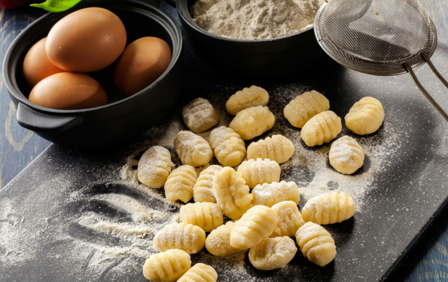 Υλικά συνταγής 500 γρ. πατάτες, 175 γρ. αλεύρι για όλες τις χρήσεις, 1 αυγό χτυπημένο, αλάτι, άσπρο πιπέρι, λίγο μοσχοκάρυδο (προαιρετικά)
