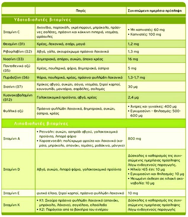 • Η κυανοκοβαλαμίνη (Β12) είναι απαραίτητη για το σχηματισμό των ερυθρών και των λευκών κυττάρων, καθώς και για το νευρικό ιστό, ενώ η ημερήσια πρόσληψη ανέρχεται στα 2,4 μg. Καλές πηγές είναι τα γαλακτοκομικά προϊόντα, τα αβγά και το κρέας.