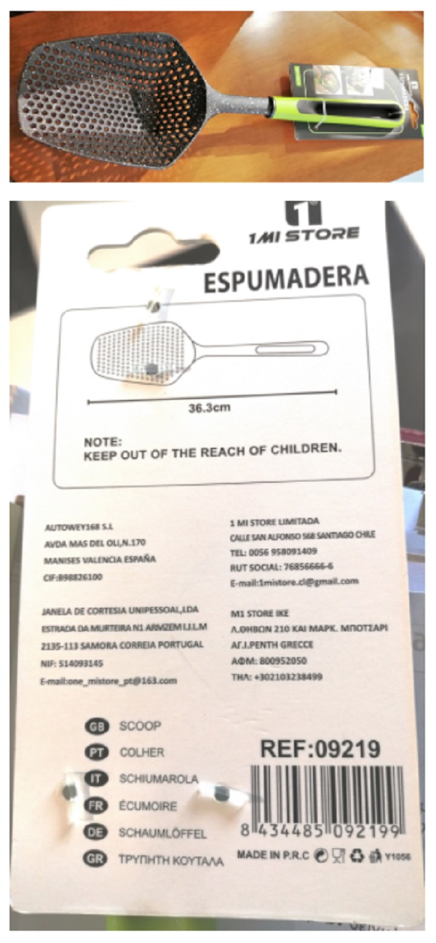 Συγκεκριμένα, ο ΕΦΕΤ και ειδικότερα η Περιφερειακή Διεύθυνση Κεντρικής Μακεδονίας, σε συνεργασία με την β΄ χημική υπηρεσία Αθηνών, του γενικού χημείου του κράτους, της Α.Α.Δ.Ε., διενήργησε δειγματοληψία στο προϊόν «Τρυπητή κουτάλα Nylon Espumadera 1 M1 Store (Ref. 09219) 36,3×12 cm».