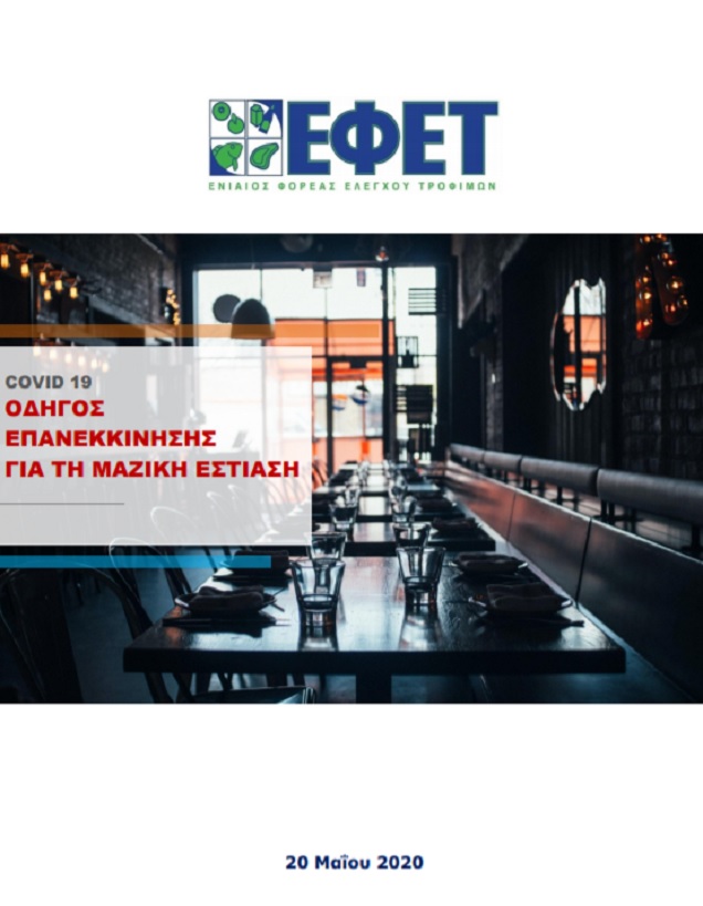 Ο Ενιαίος Φορέας Ελέγχου Τροφίμων (ΕΦΕΤ) σε συνεργασία με το Σύνδεσμο Ελληνικών Βιομηχανιών Τροφίμων (ΣΕΒΤ) και την Ελληνική Ένωση Επιχειρήσεων Οργανωμένης Εστίασης (ΕΠΟΕΣ), ενόψει της επαναλειτουργίας των επιχειρήσεων Μαζικής Εστίασης από τις 25 Μαΐου 2020, εξέδωσε τον «Οδηγό Επανεκκίνησης για τη Μαζική Εστίαση».