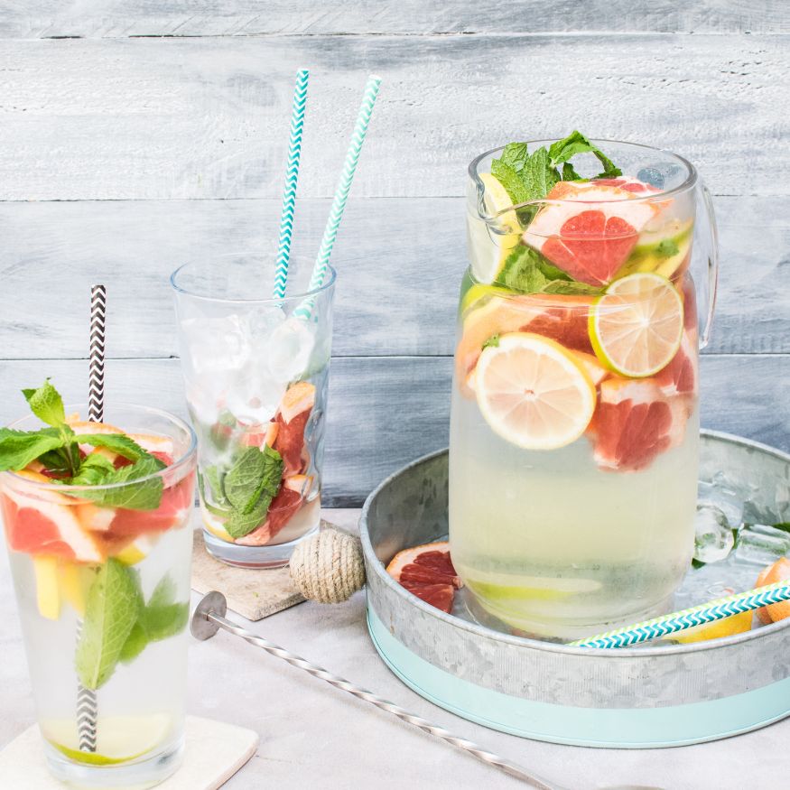 Δεν είναι μόνο διακοσμητικοί οι λόγοι που όλο και περισσότερες κανάτες με δροσερό νερό και φέτες φρούτων κοσμούν τα τραπέζια και τα γραφεία. Το απαλά αρωματισμένο νερό με εσπεριδοειδή ή με φρούτα εποχής όπως οι φράουλες, τα ροδάκινα, το καρπούζι, αλλά και μυρωδικά όπως ο φρέσκος δυόσμος, μας κρατάει ευχάριστα ενυδατωμένους, όπως οφείλουμε να είμαστε τις πολύ ζεστές μέρες, τη στιγμή που όλο και κάποια βιταμίνη θα κερδίσουμε, «ξεζουμίζοντας» με τα καλαμάκια και ρουφώντας τους χυμούς των φρούτων που μένουν στο τέλος. Μόνο προσοχή, τα νερά αυτά δεν πρέπει να αφήνονται στο ψυγείο για να καταναλωθούν άλλη μέρα.
