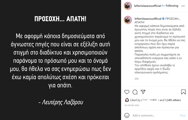 «Προσοχή… Απάτη! Με αφορμή κάποια δημοσιεύματα από άγνωστες πηγές που είναι σε εξέλιξη αυτή στιγμή στο διαδίκτυο και χρησιμοποιούν παράνομα το πρόσωπό μου και το όνομά μου, θα ήθελα να σας ενημερώσω πως δεν έχω καμία απολύτως σχέση και πρόκειται για απάτη» αναφέρει ο Λευτέρης Λαζάρου στα μέσα κοινωνικής δικτύωσης. «Παρακαλώ πολύ μη συμμετέχετε σε οποιαδήποτε ενέργεια σας καλεί η εν λόγω διαφήμιση. Την υπόθεση έχουν αναλάβει οι αρμόδιες αρχές και η δίωξη ηλεκτρονικού εγκλήματος» πρόσθεσε.