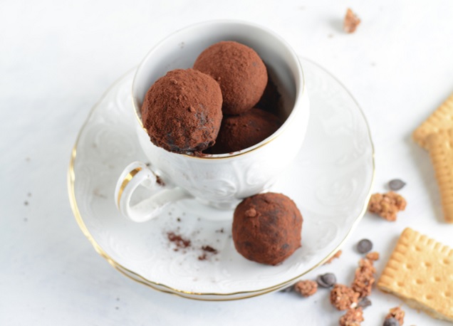 κουβερτούρα ή το κακάο, το βούτυρο και το ζαχαρούχο γάλα. Ανακατεύετε συνεχώς για περίπου 10 λεπτά μέχρι να πήξει το μείγμα. Κατεβάζετε απ’ τη φωτιά και αφήνετε το μείγμα να κρυώσει. Προσθέτετε το τριμμένο μπισκότο. 2. Όταν το μείγμα κρυώσει πολύ καλά για να πλάθεται (μπορείτε να το βάλετε στο ψυγείο), πλάθετε μικρές μπαλίτσες, τις περνάτε από το κακάο και τις βάζετε σε χάρτινες θήκες ή σε επίπεδο σκεύος στρωμένο με αντικολλητικό χαρτί. Διατηρούνται πάντα στο ψυγείο.
