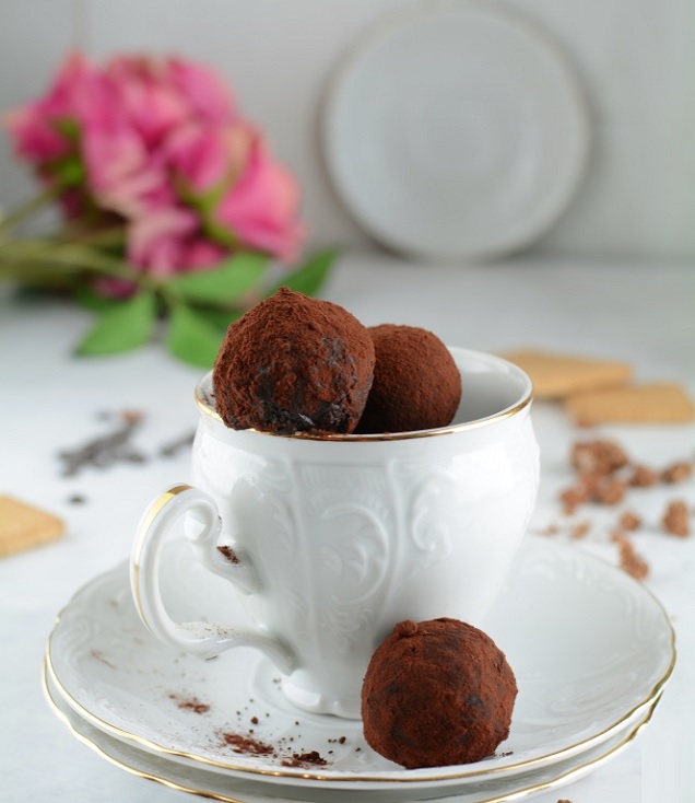 Εκτέλεση: Σε κατσαρόλα και σε μέτρια φωτιά αναμειγνύετε την κουβερτούρα ή το κακάο, το βούτυρο και το ζαχαρούχο γάλα. Ανακατεύετε συνεχώς για περίπου 10 λεπτά μέχρι να πήξει το μείγμα. Κατεβάζετε απ’ τη φωτιά και αφήνετε το μείγμα να κρυώσει. Προσθέτετε το τριμμένο μπισκότο. Όταν το μείγμα κρυώσει πολύ καλά για να πλάθεται (μπορείτε να το βάλετε στο ψυγείο), πλάθετε μικρές μπαλίτσες, τις περνάτε από το κακάο και τις βάζετε σε χάρτινες θήκες ή σε επίπεδο σκεύος στρωμένο με αντικολλητικό χαρτί. Διατηρούνται πάντα στο ψυγείο.