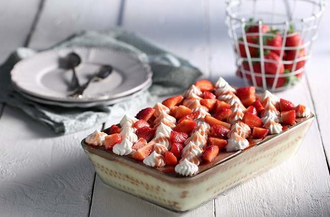 4. Χτυπάτε την κρέμα γάλακτος ή τη φυτική κρέμα σε σαντιγί και την απλώνετε στην επιφάνεια του γλυκού. Μοιράζετε και τις φράουλες. Αφήνετε στο ψυγείο για μιάμιση ώρα και είναι έτοιμο για σερβίρισμα.