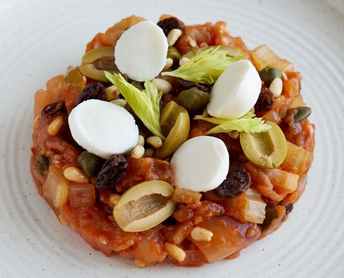 Σοτάρετε σε 4-5 κουταλιές ελαιόλαδο με τη σειρά 2 κρεμμύδια ψιλοκομμένα, λίγο σέλερι ψιλοκομμένο, 2 μελιτζάνες κομμένες σε κύβους ανακατεύοντας μέχρι να τηγανιστούν. Σε άλλο σκεύος ρίχνετε 1 ντομάτα τριμμένη, ½ κουταλιά της σούπας πελτέ, 2 κουταλιές της σούπας ξίδι και μία κουταλιά της σούπας ζάχαρη. Μαγειρεύετε τη σάλτσα μέχρι να ομοιογενοποιηθούν τα υλικά. Τη ρίχνετε στις μελιτζάνες μαζί με λίγη κάππαρη και μερικές ελιές χωρίς κουκούτσι. Αλατίζετε και μαγειρεύετε όσο χρειαστεί να απορροφήσουν τα πολλά υγρά. Προσθέτετε κουκουνάρι και βασιλικό και σερβίρετε.
