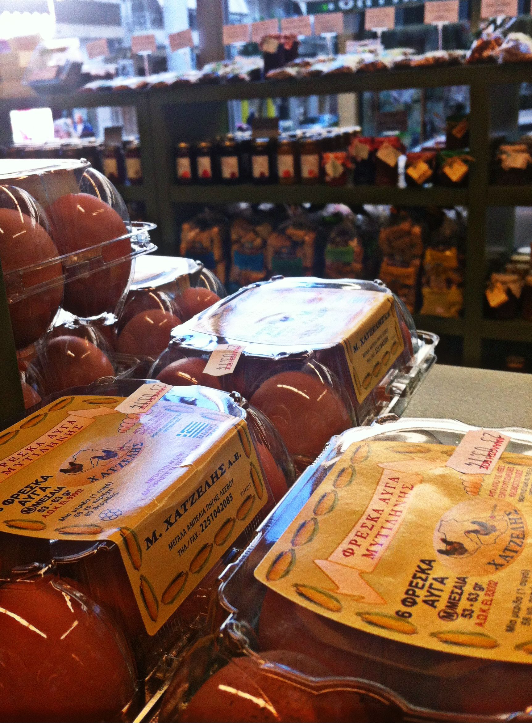 Ένα χρόνο στην Αγορά του Βύρωνα το «Αυγοπωλείον Χατζέλη» κι έχει πλέον αποκτήσει τη φανατική του πελατεία –όχι άδικα. Είναι αληθινή πολυτέλεια να έχεις στην Αθηνά κάθε μέρα φρέσκα αυγά από την Πηγή Μυτιλήνης και από κότες που εκτρέφονται σε υψόμετρο 300 μ. μέσ’ στο πεύκο. Και να φτιάχνεις τις ουζοποικιλίες σου για να πιεις ένα Βαρβαγιάννη ή έναν Πιτσιλαδή με ντόπιο λαδοτύρι και εκλεκτή γραβιέρα, σαρδέλες Καλλονής, λογής λογής ελιές και παξιμαδάκι χειροποίητο – όλα από το νησί. Και να έχεις ένα βήμα από την πόρτα σου κρασί της Λήμνου και τυριά και γαλακτοκομικά με βορειοαιγαιοπελαγίτικο αέρα. Να βρίσκεις όμορφα συσκευασμένα και ταχτοποιημένα στα ραφάκια τους τα καλούδια του νησιού, τραχανάδες, κοχυλάκι, κουσκουσάκι, μανεστράκι, για φαγητά φούρνου ή κατσαρόλας με την πλούσια γεύση της ελληνικής παράδοσης.