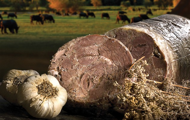 Κομμάτια χοιρινού κρέατος ζυμωμένα με κομμάτια λίπους, ολόκληρα πιπέρια και μπαχαρικά. Η σωστή και μακρά ωρίμανση στον αέρα κάνει τη διαφορά.