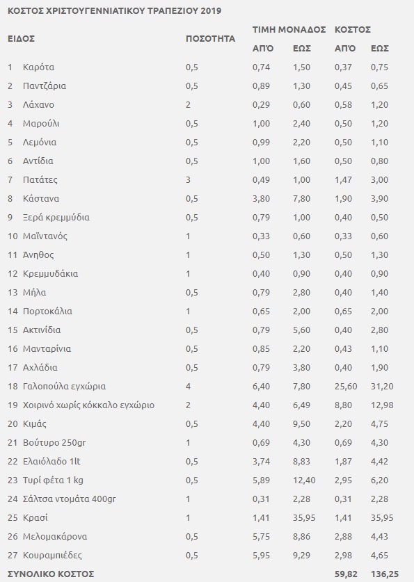 Ο πίνακας του ΚΕΠΚΑ για τις τιμές των προϊόντων του χριστουγεννιάτικου τραπεζιού