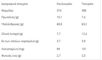 Η θρεπτική τους σύσταση όσο και η ενεργειακή τους αξία δεν διαφέρει σημαντικά όταν συγκρίνουμε ιδίου βάρους τεμάχια και αυτό διότι στις παραδοσιακές πασχαλιάτικες συνταγές, βλέπουμε ότι κουλουράκια και τσουρέκια φτιάχνονται με παρόμοια υλικά, όπως αλεύρι, ζάχαρη, βούτυρο και αβγά, επομένως τόσο.