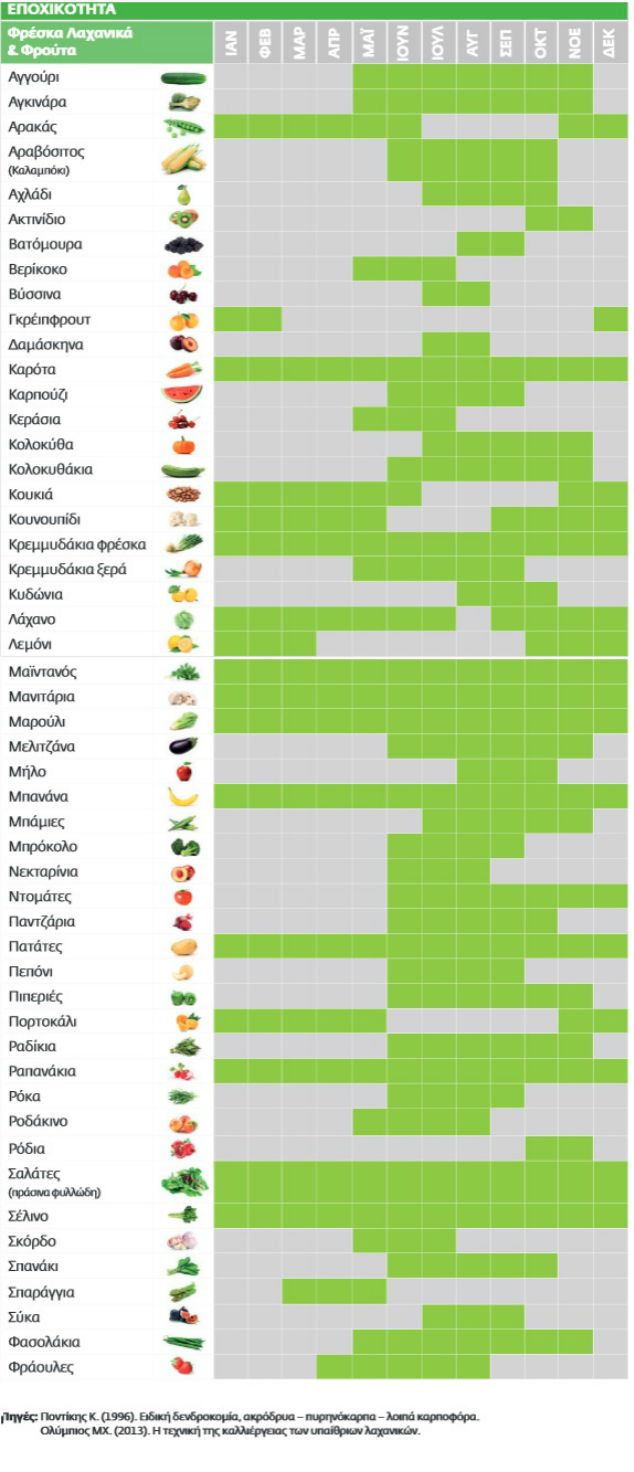 Φρούτα και λαχανικά στην εποχή τους! Μια συνήθεια που συμβάλλει στον να γίνει το καθημερινό μας τραπέζι πιο υγιεινό, πιο θρεπτικό, πιο απολαυστικό και πιο οικονομικό. Με τον πίνακα που εμπεριέχεται στον Εθνικό Διατροφικό Οδηγό για Ενήλικες μαθαίνουμε τι βγαίνει φρέσκο κάθε μήνα στις αγορές και αντλούμε ιδέες για το μαγείρεμα της κάθε μέρας.