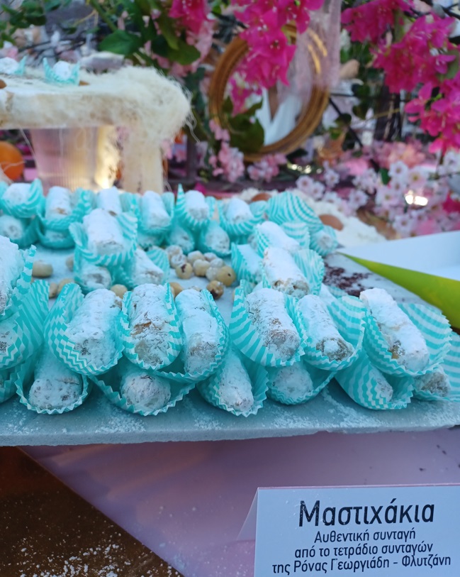 Από τον εκμαυλιστικό μπουφέ παρέλασαν γλυκά-συνταγές του 19ο αιώνα μέχρι δημιουργίες των θρυλικών ζαχαροπλαστείων του νησιού της δεκαετίας του ’80, αλλά και new age γλυκά που ετοίμασαν οι pastry chefs, εμπνευσμένοι από το ζαχαροπλαστικό παρελθόν του νησιού, όπως: η νέα Φραγκοτυρόπιτα, η Κουβανέζα Celia, τα Μαστιχάκια με μους μαστίχας, τα Ροδίνια με κρέμα diplomat, και άλλες καινούριες γεύσεις ποτισμένες με αναμνήσεις από το παρελθόν.