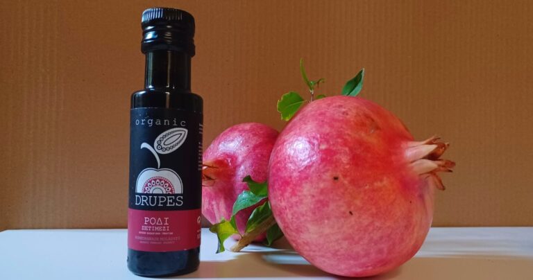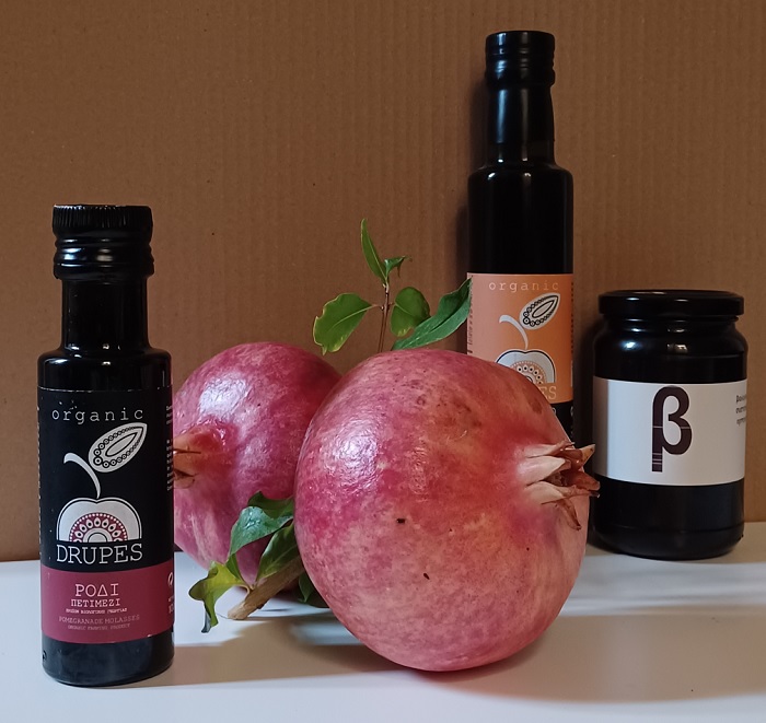 Εξαιρετικό το πετιμέζι ροδιών, ο σούπερ συμπυκνωμένος χυμός από τους βιολογικούς καρπούς του κτήματος που δοκιμάσαμε στο Peloponnese Food Stories στα Μεσαία Τρίκαλα Κορινθίας. Χωρίς προσθήκες, χαμηλού γλυκαιμικού δείκτη, κατάλληλος και για διαβητικούς, γίνεται από αναψυκτικό (αραιωμένος με νερό) μέχρι dressing για σαλάτα, συστατικό μαρινάδας ή υλικό ζαχαροπλαστικής. Αξίζει επίσης να δοκιμάσει κανείς όποτε τη βρει τη μαρμελάδα από βιολογικά βερίκοκα με καστανή ζάχαρη και αρμπαρόριζα αλλά και τη βαλσαμική κρέμα βερίκοκο.