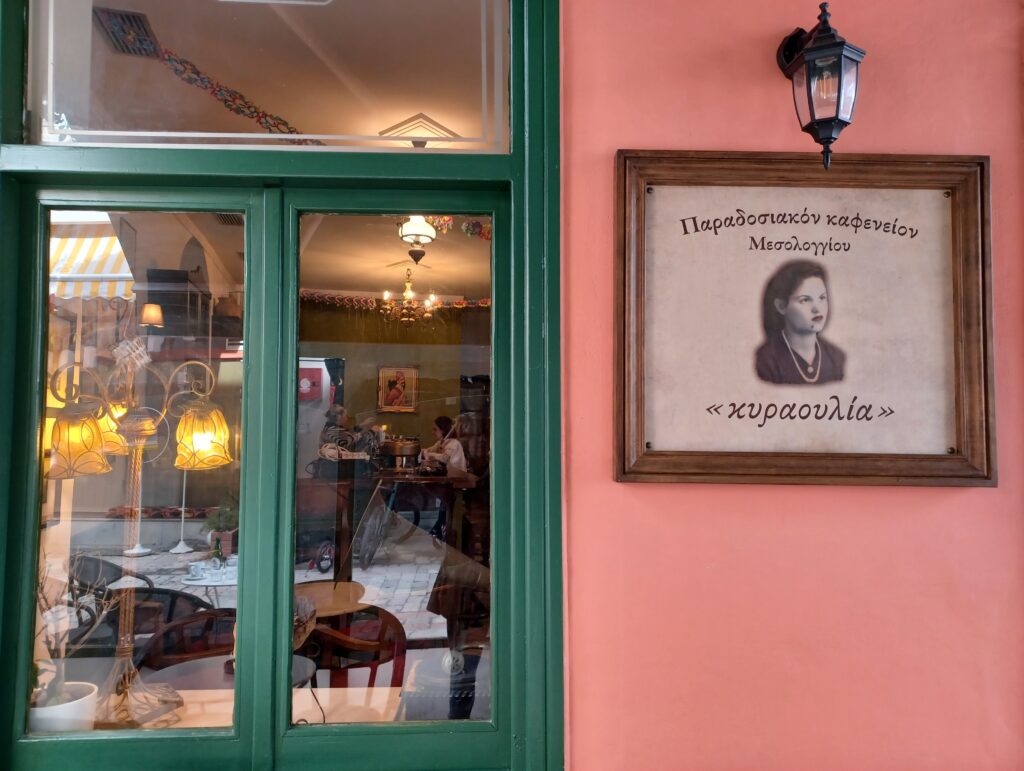 Το ένα είναι η «Κυραουλία». Έτσι φώναζαν οι Μεσολογγίτες την κυρία Ιουλία, γιαγιά του Βαγγέλη, που έφτιαξε το όμορφο αυτό στέκι. Στεγάζεται σε νεοκλασικό, από τα πιο παλιά της πόλης. Πραγματικό κόσμημα τα ξύλινα τραπέζι με το μάρμαρο που περιέσωσε από κλείσιμο παλιού, πατρινού καφενείου. Μεσολογγίτικα κειμήλια και παλιά αντικείμενα ομορφαίνουν τον εσωτερικό χώρο, που λειτουργεί και ως μπαράκι τις νύχτες, ενώ κάνει συχνά πάρτι και λάιβ. Σερβίρει και έξω.