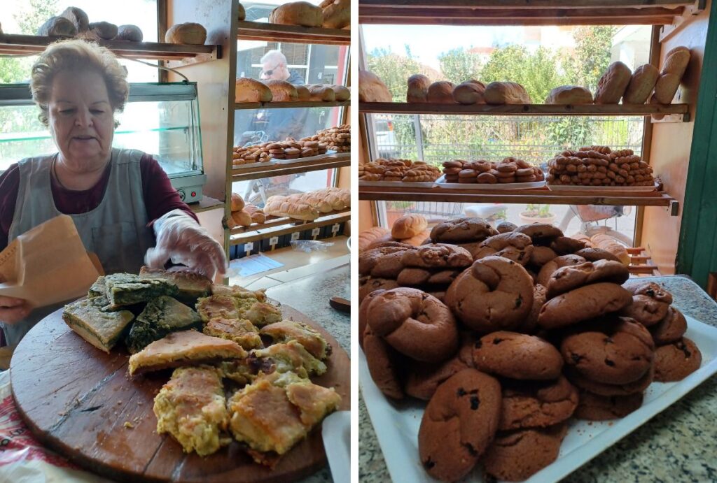 Στον ξυλόφουρνο της κυρίας Αντωνίας -που δεν έχει σταματήσει να λειτουργεί για πάνω από έναν αιώνα- («ούτε στην Κατοχή δεν σταμάτησε», λέει η ίδια) δεν ξέρεις ποια από τις χειροποίητες πίτες της με το σπιτίσιο φύλλο να πρωτοδιαλέξεις. Ό,τι και αν καταλήξεις τελικά να πάρεις, χορτόπιτες, τυρόπιτες, μακαρονόπιτες, βάλε οπωσδήποτε και μια αλμυρή κολοκυθόπιτα με κίτρινη κολοκύθα στο σακουλάκι σου. Τριάντα χρόνια ζυμώνει και φουρνίζει ψωμί, κουλουράκια και γλυκά ταψιού, όπως το τοπικό «ριβανί» στον παραδοσιακό φούρνο με ξύλα. Ξεκινά από τις 3.00 τα ξημερώματα για να είναι έτοιμη στις 7.00-7.30 το πρωί που θα μπουν οι πρώτοι πελάτες αδημονούντες να γευτούν για τις νοστιμιές της.
