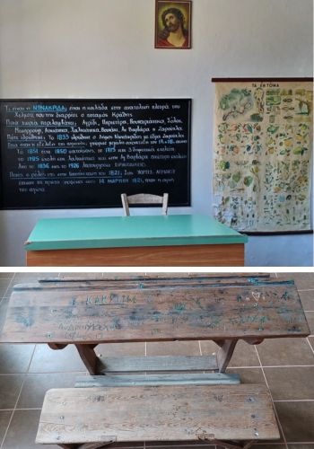 Βολτάροντας στα κοντινά μονοπάτια της Ζαρούχλας αργά ή γρήγορα περνάς από το πέτρινο σχολείο που μοιάζει να ξεπηδάει από το παλιό αναγνωστικό με το Μίμη και τη Λόλα. Σήμερα είναι ανοιχτό, ένα μικρός άτυπος εκθεσιακός χώρος με πληροφορίες στους τοίχους του για την ιστορία της περιοχής και τη «Νωνακρίδα της ομορφιάς και της ιστορίας».