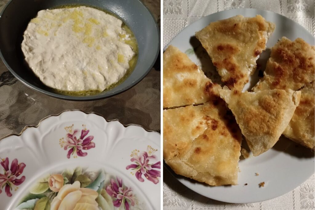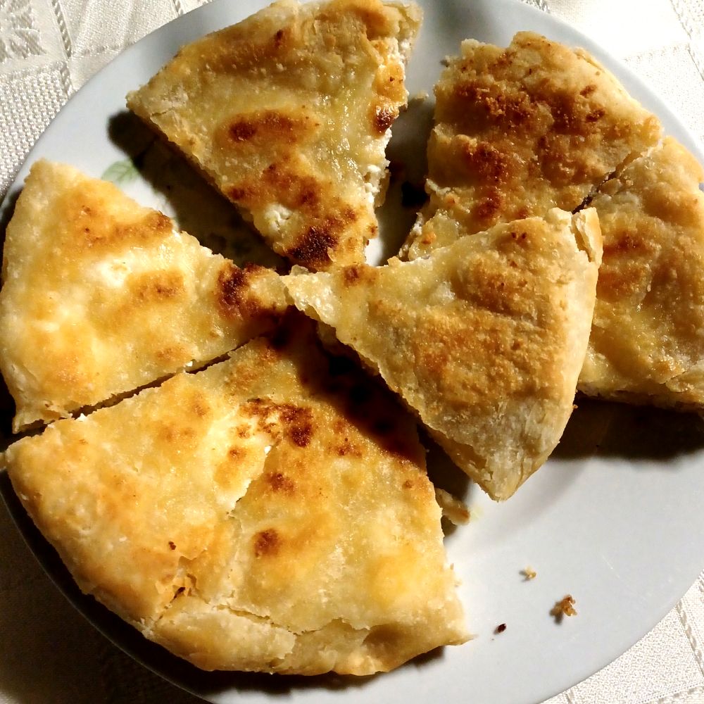 Εκτέλεση: Ανακατεύετε τα υλικά της ζύμης με στόχο να αποκτήσετε ένα ζυμαράκι πολύ μαλακό, ώστε να ανοίγεται εύκολα σε δισκάκι. Εκεί μέσα βάζετε την ξινούτσικη μυζήθρα (μια χούφτα ζύμη, μια χούτα μυζήθρα). Κλείνετε ζυμαράκι σα σε πουγκί και τοποθετείτε το ζυμαρένιο πουγκί σε ελαφρά λαδωμένο τηγανάκι. Βουτάτε τα χέρια σας σε λίγο νερό και απλώνετε πιέζοντας με τα δάχτυλα ή τις μπουνίτσες το πουγκί σε λεπτό λεπτό δίσκο (φύλλο), προσπαθώντας ταυτόχρονα να μοιράζετε το τυρί σε όλη την επιφάνεια της πίτας. Τηγανίζετε και από τις δύο μεριές μέχρι να ροδίσει η ζύμη και να ψηθεί και σερβίρετε την τραγανή πίτα σκέτη ή περιχυμένη με μέλι.