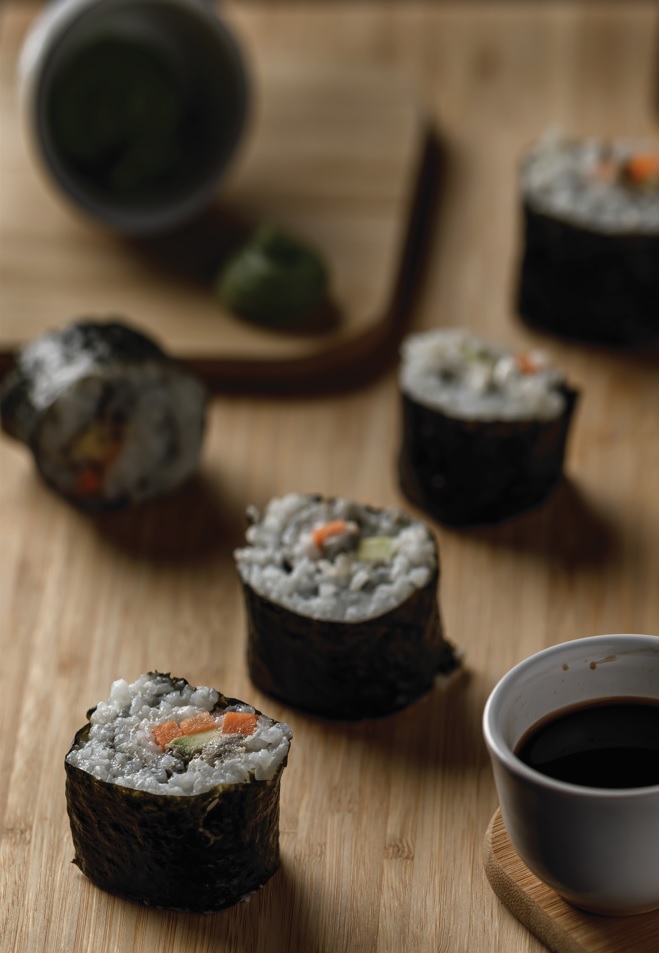 του φύλλου και αφήνοντας ένα εκατοστό πάνω και κάτω. 7. Βάζουμε τα λαχανικά, τα μυρωδικά, 3-4 φιλέτα γαύρου, πολύ λίγη κρέμα γουασάμπι. 8. Ξεκινάμε το ρολάρισμα, ασκώντας στην αρχή λίγη πίεση για να δέσουν τα υλικά, και μετά προχωράμε με απαλότερες