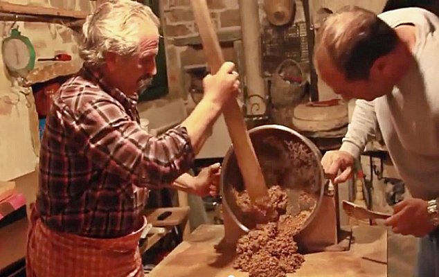 Στο βίντεο βλέπουμε τον Γιώργο Βασσάλο να καθαρίζει τον πάγκο με γλυκό κόκκινο κρασί και να ζυγίζει το σουσάμι και το μέλι, που πρέπει να είναι 1 προς 1. Στη συνέχεια τα ρίχνει στο τσουκάλι και αρχίζει να τα ανακατεύει συνεχώς σε σιγανή φωτιά, ώστε να απελευθερωθούν τα αρώματα και όλη η γεύση του σουσαμιού. «Παλιά βγάζαμε κι εδώ σουσάμι» ακούγεται να λέει η κυρά. Τώρα χρησιμοποιούν ελληνικό σουσάμι απ’ τη Χαλκιδική. Στην περίπου μισή ώρα πεισματικού ανακατέματος ο Γιώργος Βασσάλος βγάζει μια κουταλιά του μείγματος, την περιμένει λίγο να κρυώσει και δοκιμάζει. Μόλις κρίνει ότι το μείγμα είναι έτοιμο το αδειάζει πάνω στο τραπέζι.