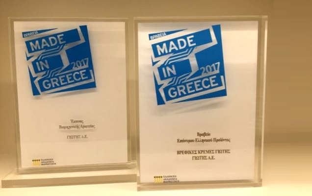 Δύο πολύ σημαντικές διακρίσεις έλαβε η ΓΙΩΤΗΣ A.E. στα βραβεία «Made in Greece 2017» που διοργανώνει η Ελληνική Ακαδημία Μάρκετινγκ, με σκοπό να αναδείξει και να επιβραβεύσει τις επιχειρήσεις και τους οργανισμούς που επιτυγχάνουν εξαιρετικές επιδόσεις στην παραγωγή και διάθεση προϊόντων με σημαντική προστιθέμενη αξία για την Ελληνική Οικονομία.