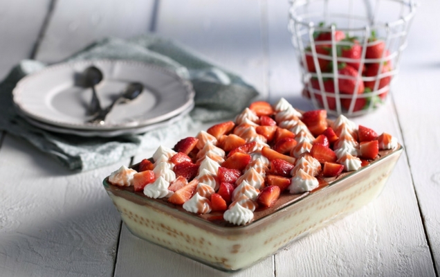 5. Ετοιμάζετε το Garni Βανίλια ΓΙΩΤΗΣ σύμφωνα με τις οδηγίες της συσκευασίας του και στολίζετε την επιφάνεια του γλυκού. Μοιράζετε και τις φράουλες. Αφήνετε στο ψυγείο για μιάμιση ώρα και είναι έτοιμο για σερβίρισμα.