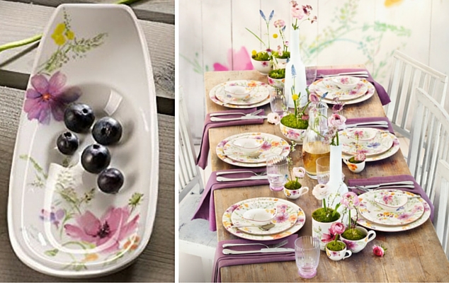 Απ’ τους ίδιους κήπους εμπνέονται σήμερα και οι designers της Villeroy&Boch, του γνωστού Οίκου στο χώρο της πορσελάνης, και δημιουργούν το Mariefleur, ένα από τα πιο διάσημα σερβίτσια της. Πινελιές με έντονο χρώμα εναλλάσσονται αρμονικά με απαλούς συμπληρωματικούς τόνους δίνοντας ένα υπέροχο φλοράλ σερβίτσιο που μπορεί να συνδυαστεί σχεδόν με όλα τα μονόχρωμα αντικείμενα του σπιτιού: πράσινα, ροζ, κίτρινα και μπλε. Καθώς η σειρά συμπληρώνεται με πολλά εποχικά διακοσμητικά και το μοβ, το ροζ, το βιολετί κάνουν αισθητή την παρουσία τους στα περισσότερα κομμάτια της, θεωρείται ιδανική για το ανοιξιάτικο και πασχαλινό τραπέζι.