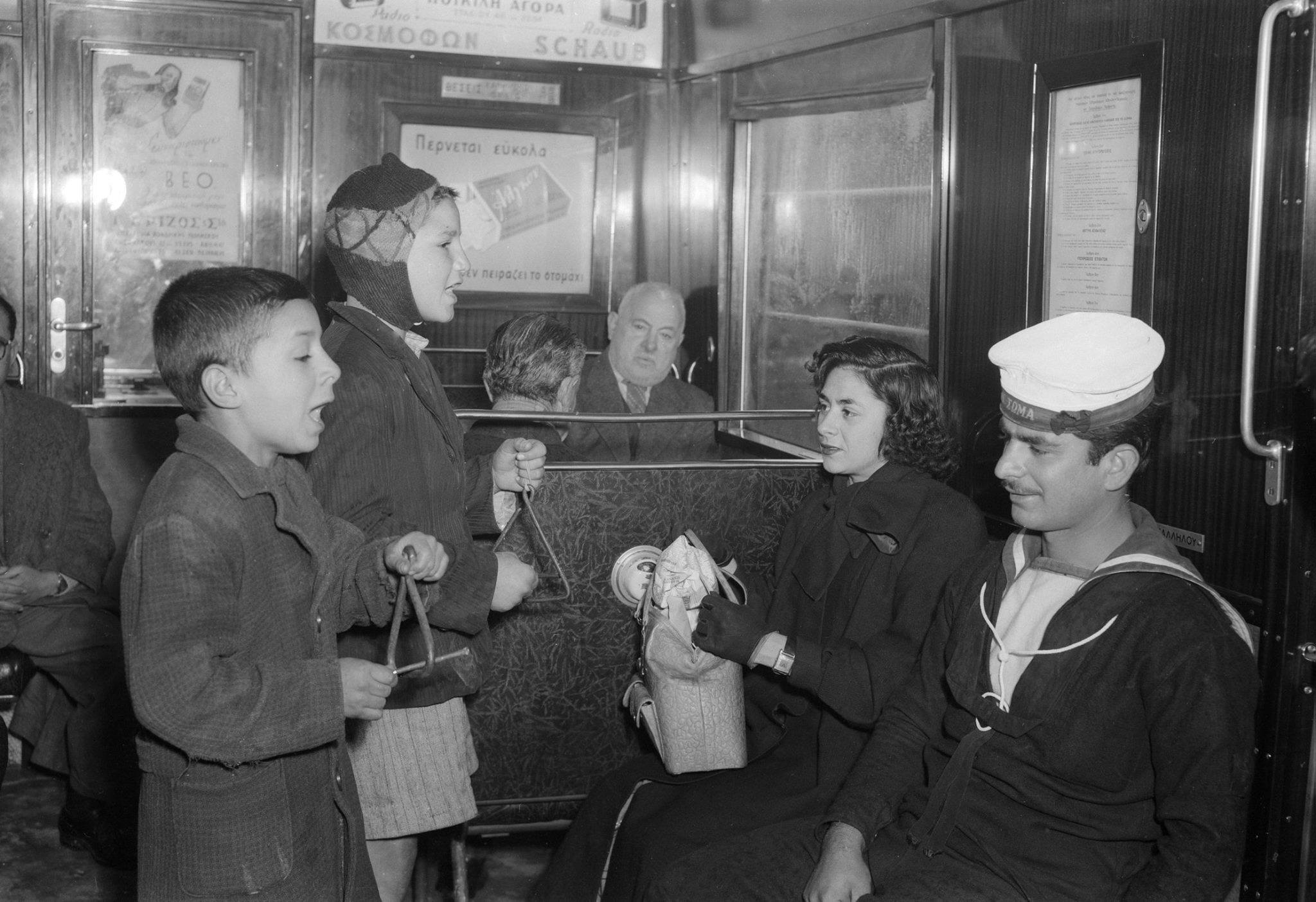 Κάλαντα στον ηλεκτρικό σιδηρόδρομο. Αθήνα, παραμονή πρωτοχρονιάς 1953. Φωτογραφία Δημήτρης Χαρισιάδης. Φωτογραφικό Αρχείο Μουσείου Μπενάκη