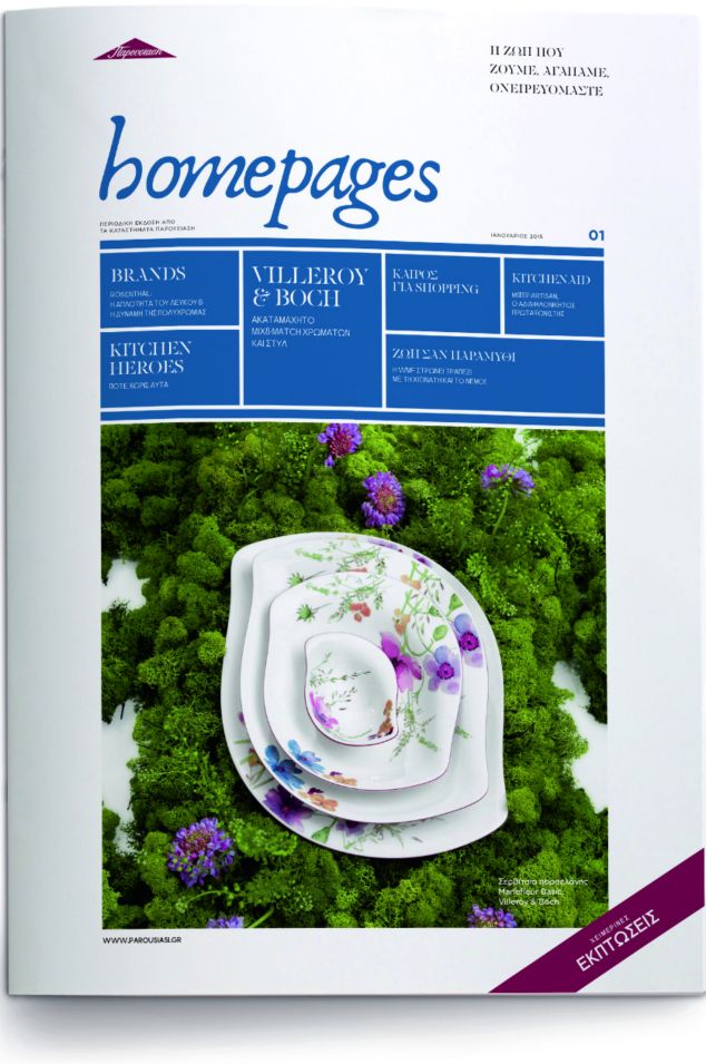 Περισσότερα για τα living trends και τη φιλοσοφία της ζωής που ζούμε, αγαπάμε, ονειρευόμαστε, θα ανακαλύψουμε ξεφυλλίζοντας το ολοκαίνουριο Homepages. Το πρώτο τεύχος του περιοδικού της Παρουσίασης είναι εδώ και υπογράφει τα πιο φρέσκα κεφάλαια του σπιτιού μας: με πληροφορίες για θρυλικούς οίκους, με αναφορές σε ταλαντούχους σχεδιαστές, με κατευθύνσεις για τη νέα αρχιτεκτονική του τραπεζιού, με food-and-drinking tips και με παρουσίαση δεκάδων προϊόντων σε προσφορά. Αναζητούμε το προσωπικό μας δωρεάν αντίτυπο στα καταστήματα ή online.