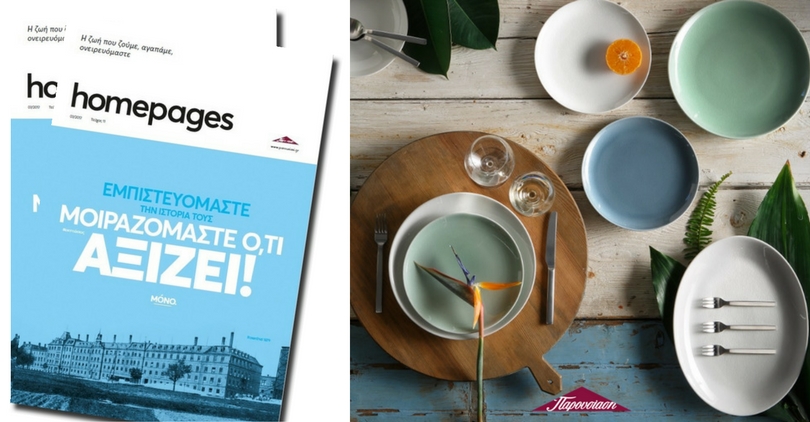 Το Homepages είναι η περιοδική έκδοση των καταστημάτων Παρουσίαση και μπορεί να το προμηθευτεί κανείς δωρεάν από τα ίδια τα καταστήματα. Το καινούριο τεύχος είναι αφιερωμένο στις καλοκαιρινές εκπτώσεις και περιλαμβάνει πάνω από 100 ιδέες κορυφαίων brands σε προνομιακή τιμή για την κουζίνα, το σερβίρισμα, το σπίτι ή για δώρα γάμου. To μέσο ποσοστό έκπτωσης κυμαίνεται στο 20%-25%, ωστόσο υπάρχουν κάποιες πραγματικά σημαντικές εξαιρέσεις σε μεγάλα ονόματα, που αν σκοπεύατε να προβείτε σε σχετική αγορά, θα θέλατε να τις ξέρετε, αλλά και αρκετά πιο οικονομικά αλλά πάντα επώνυμα προϊόντα.