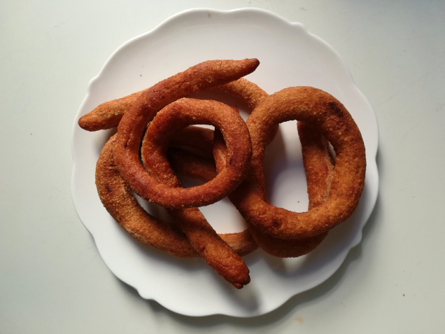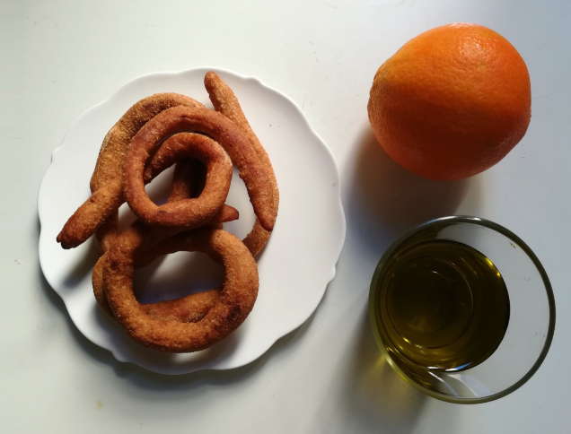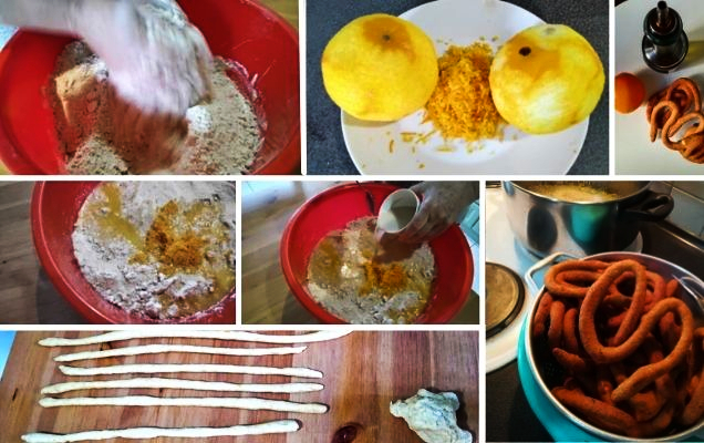 1 ½ κιλό αλεύρι, 1 ½ φλιτζάνι του τσαγιού ελαιόλαδο, 1 ½ φακελάκι ξερή μαγιά, 2 πορτοκάλια (το ξύσμα και ο χυμός τους), γύρω στα 600ml νερό και λίγο χλιαρό νερό ακόμη για να διαλύσετε τη μαγιά, 2- 3 κουταλάκια του γλυκού κοφτά αλάτι, ελαιόλαδο για το τηγάνισμα
