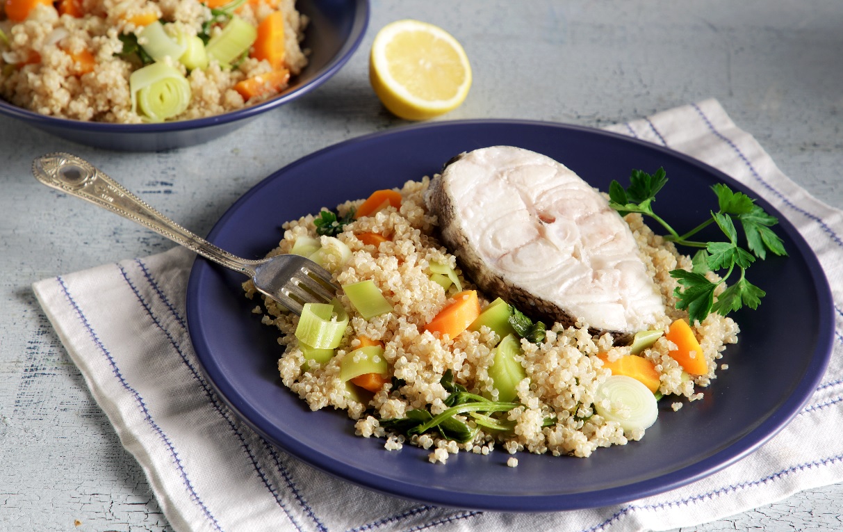 - Σερβίρετε το βραστό ψάρι αφού περιχύσετε με τον υπόλοιπο χυμό λεμονιού συνοδευμένο από το κινόα με τα βραστά λαχανικά.