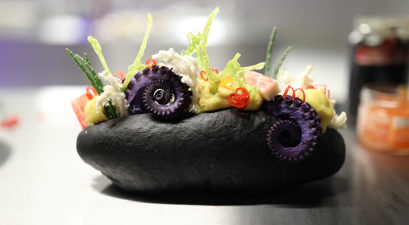 Ωστόσο, τις εντυπώσεις στο σποτάκι, που αποτελεί συνέχεια του τίζερ με τους τρεις κριτές παστωμένους σε μικρό αυτοκίνητο στα… μέτρα του Λεωνίδα Κουτσόπουλου, έκλεψε ένα σάντουιτς-υπερθέαμα με εντυπωσιακά χρώματα και στήσιμο, φτιαγμένο από κατάμαυρο ψωμί και μοβ χταπόδι, που έμοιαζε σχεδόν …ψεύτικο.