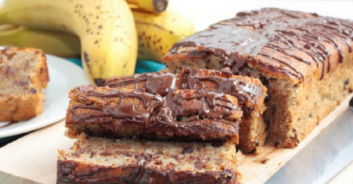 Υλικά συνταγής: 3 πολύ ώριμες μπανάνες, 1 φλιτζάνι γεμάτο αλεύρι που φουσκώνει μόνο του, 1 κουταλιά της σούπας βούτυρο και λίγο για το άλειμμα της φόρμας, 1 κουτί ζαχαρούχο γάλα, 4 αυγά, 2 κουταλιές της σούπας μερέντα, 2 κουταλιές κουβερτούρα σε σταγόνες