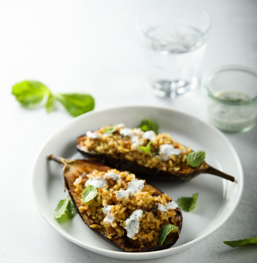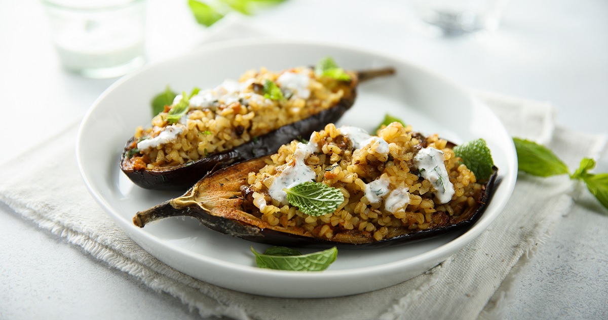 FOOD STORIES | Γεμίστε τις ψητές μελιτζάνες με θρεπτικό πλιγούρι, αρωματίστε τις με μυρωδάτο δυόσμο και συνοδέψτε τις με δροσερό ντιπ γιαουρτιού για ένα καλοκαιρινό πιάτο χορταστικό, ισορροπημένο και πεντανόστιμο.